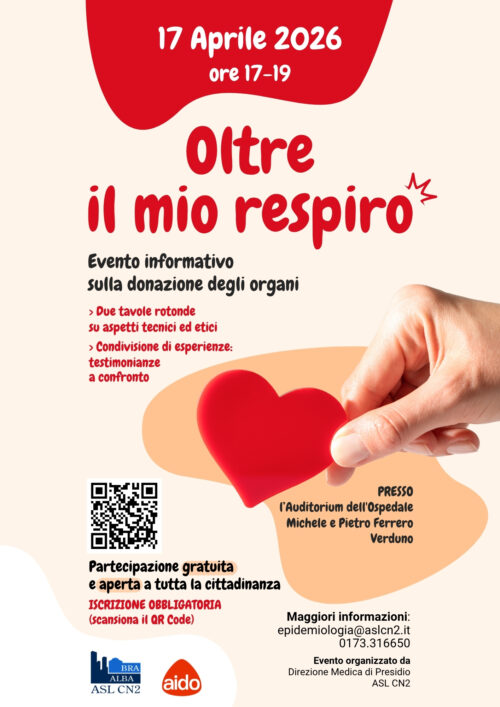 All’interno di questo scenario nazionale, l’ASL CN2 organizza l’evento informativo “Oltre il mio respiro”, un’iniziativa pensata come spazio di dialogo, approfondimento e condivisione di esperienze sul tema della donazione di organi.
