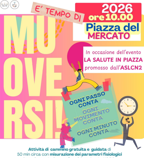 “Salute in Piazza” è stata affiancata da un’attività di cammino di 40 minuti circa, facoltativa, gratuita e guidata, organizzata dai professionisti del Dipartimento di Prevenzione dell’ASL CN2. La camminata sarà preceduta e seguita dalla misurazione di alcuni parametri fisiologici (pressione arteriosa e glicemia), che permette ai partecipanti di avere un riscontro immediato dei benefici apportati dall’attività fisica. Per informazioni sulle attività di cammino: epidemiologia@aslcn2.it o 0173/316621.