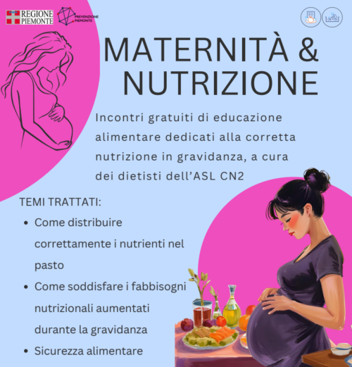di Verduno (2 marzo e 4 maggio – ore 17.00-18.30). L’incontro si propone di fornire alle future mamme indicazioni pratiche per seguire un’alimentazione equilibrata e sicura durante tutto il percorso della gravidanza, affrontando temi quali il corretto fabbisogno nutrizionale, la prevenzione dei rischi alimentari, la gestione di eventuali disturbi comuni e l’importanza di uno stile di vita complessivamente salutare.